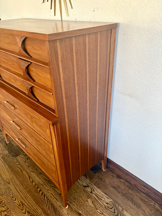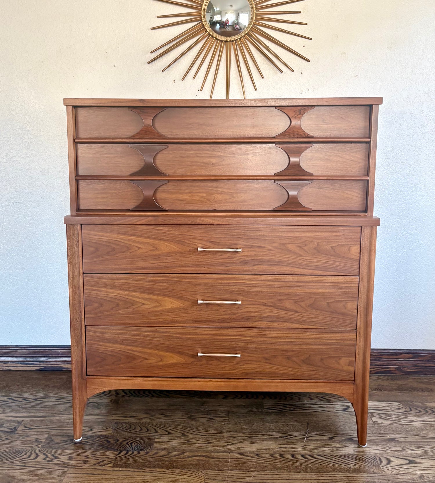 Kent Coffey Perspect0 Mid-Century Modern Walnut Highboy Dresser | Sculpted Wood Front | Vintage MCM Chest of Drawers