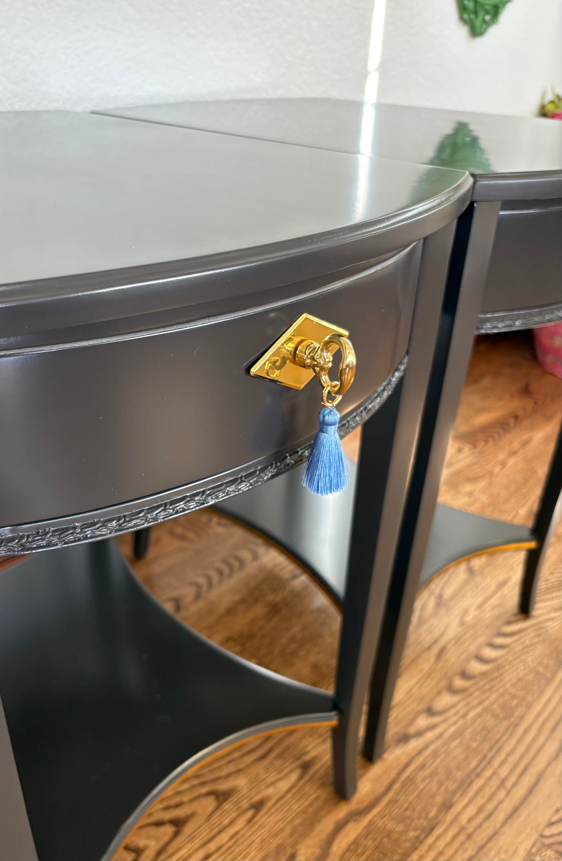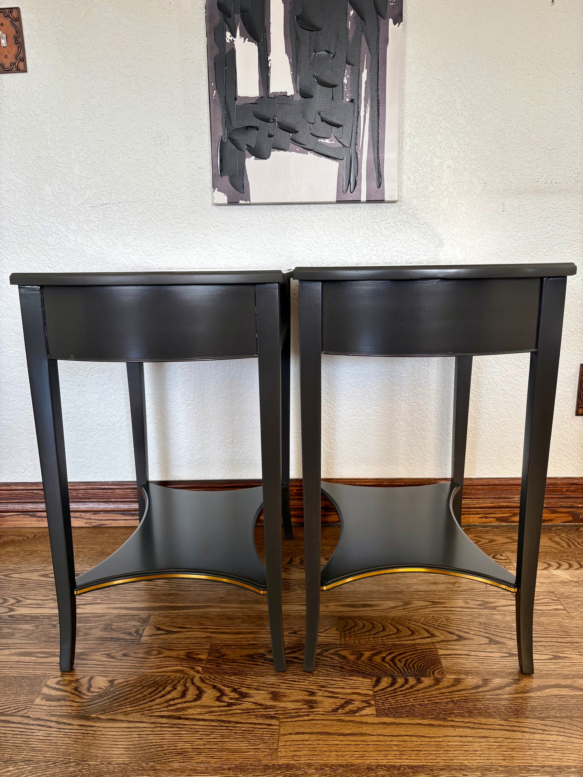 This pair features so many details that make these deceptively simple pieces intricate; such as roped edged detailing on the bottom of each drawer front, a star shaped shelf gently sloped curved legs, and a pop of color on the inside of each drawer box with gold detailing. They are freshly lacquered in satin sheen in a a classic black (the color name is Jet Black by Sherwin-Williams) giving these a very royal finish. They are finished front to back so could easily float in a room as to display them in totality.