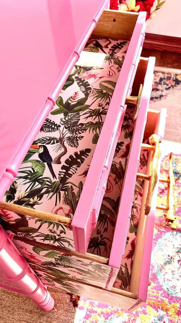 The lacquered pieces in this listing are examples of a finish in a high gloss sheen, Stain and Matte sheens are also available. The actual piece available is the yellow piece listed in the last photo of this listing. The original factory (bamboo metal style hardware on the yellow piece in the last photo) is original to be cleaned and polished. The hardware on the featured pink photo is upgraded hardware, available at cost.