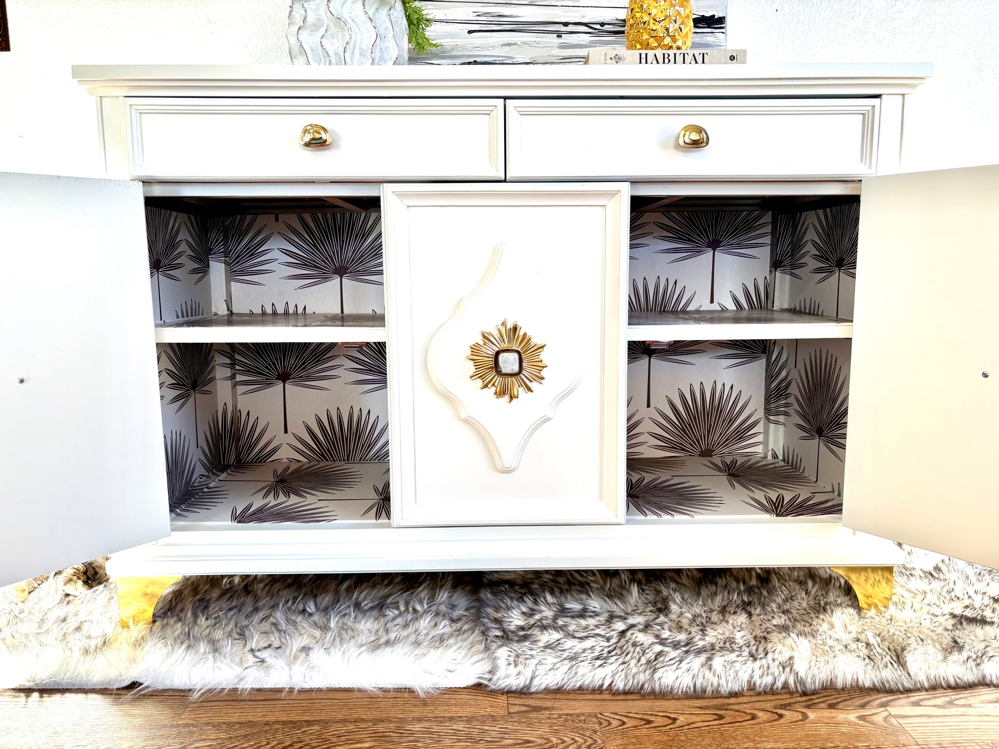 Vintage Hollywood Regency Credenza – White & Gold Sideboard with Ornate Floral Medallions